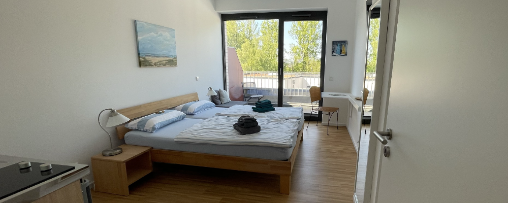 Für Besuch gibt es eine eingerichtete Gästewohnung mit Bad und einer kleinen Küche. Sie bietet eine gemütliche Übernachtungsmöglichkeit im Atriumhaus für Freunde, Familie und Gäste.